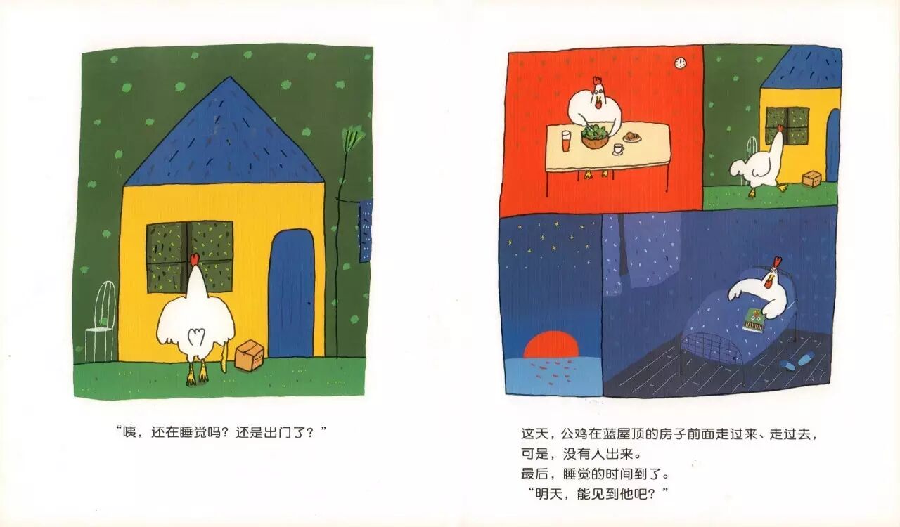 公鸡希望能和新邻居成为朋友,总是盼着能见到对方。可是,公鸡在蓝屋顶的房子前走来走去,却怎么也遇不到这位神秘的新邻居……“在睡觉吗?还是出门了?”“是不是搬家太累了,起不来呢?”“好想见一面呀!”在这一源源不断的情节变化中,我们看到了一种真诚,一种热情和一种单纯而又坚定的信念。