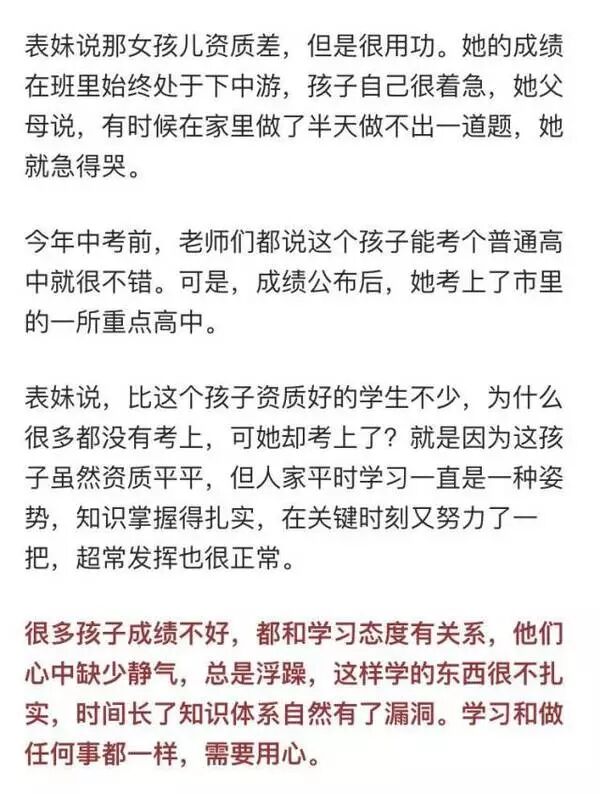 她这种不疾不徐的性格,就算以后考不上好大学,学一门技能,也能无忧地生存。就怕那种脑子好用,却不用心的孩子,成绩忽高忽低,情绪一会儿阴一会晴,最终难成一事。