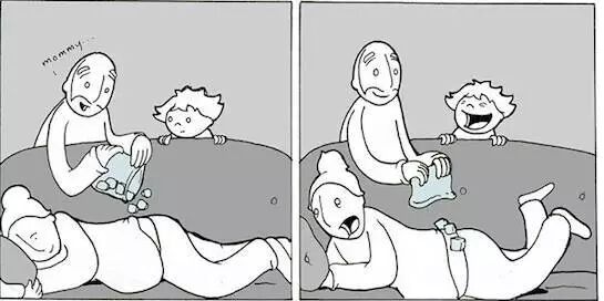 然后趁着妈妈不注意,把冰块倒在她身上,把妈妈吓坏了。