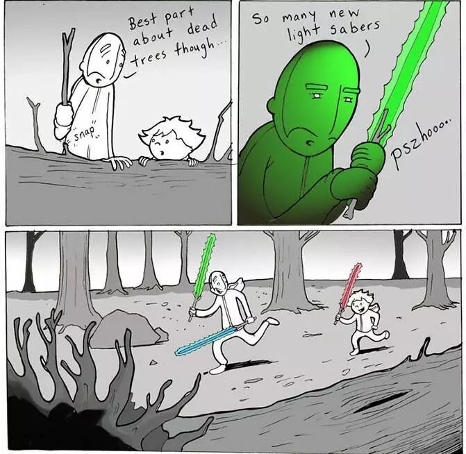 “最棒的是,这些树枝还可以拿来做激光剑!”