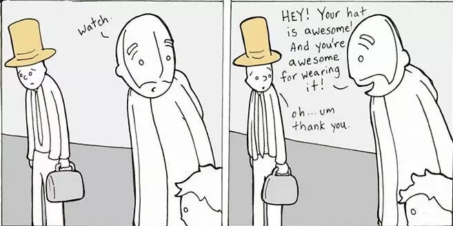 然后我走上去,对着这个路人说,“嗨,你的帽子酷毙了,你带起来好帅!”