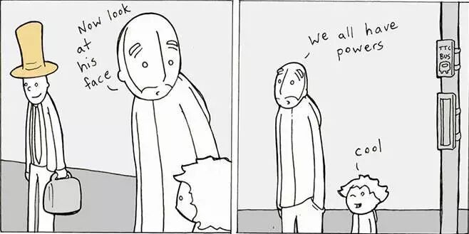 这时,我再让儿子看,“现在,看看那个人的表情,我们都有超能力。”