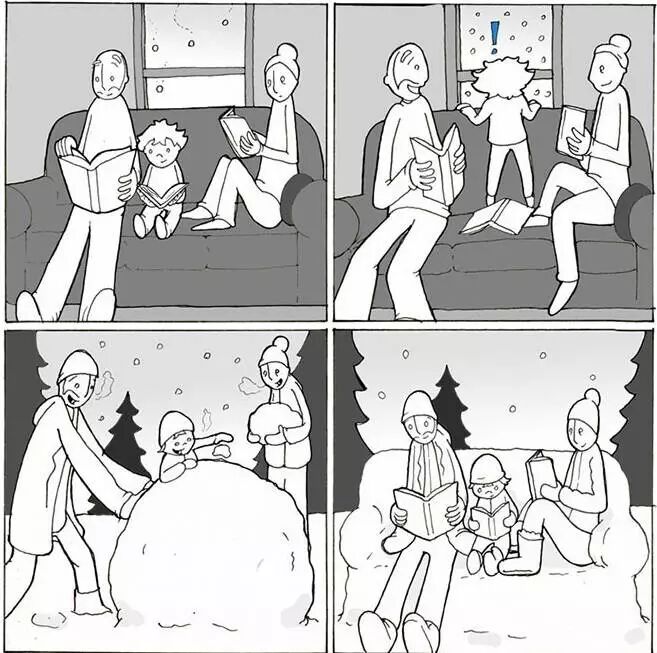 要是赶上下雪天,我们就跑出门玩雪,做一张雪沙发,然后继续看书。