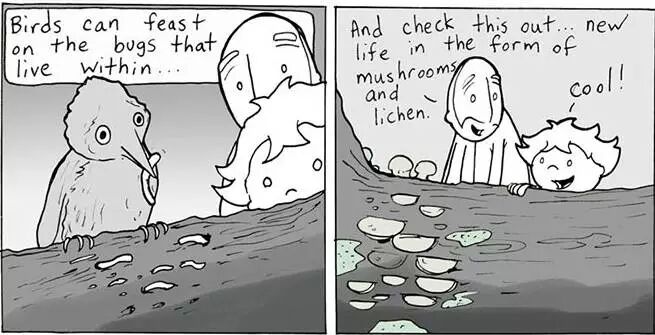“就连虫子,也可以靠吃树上的蛀虫维持生命。还有,看看这里,蘑菇和青苔是新生命的预兆。“